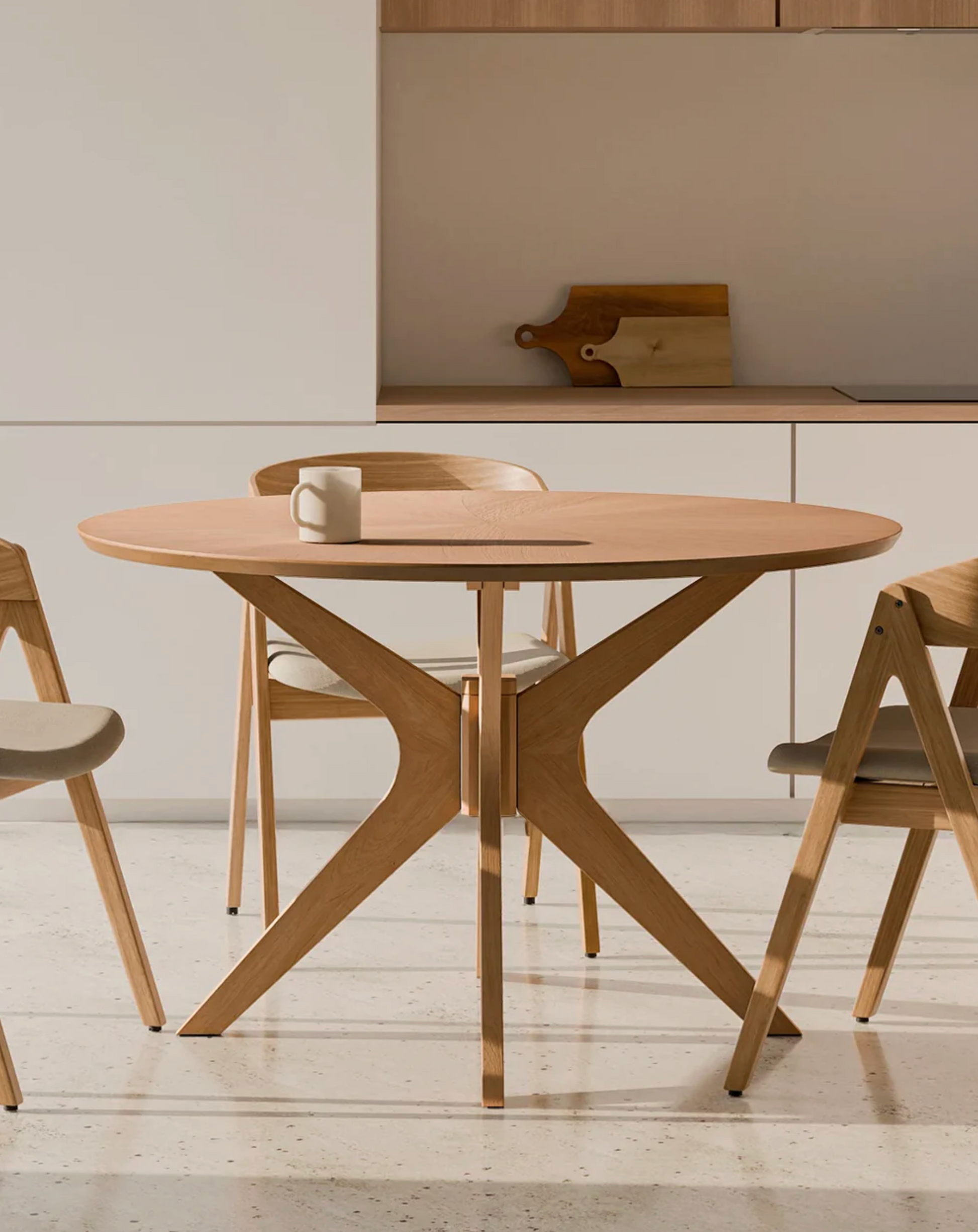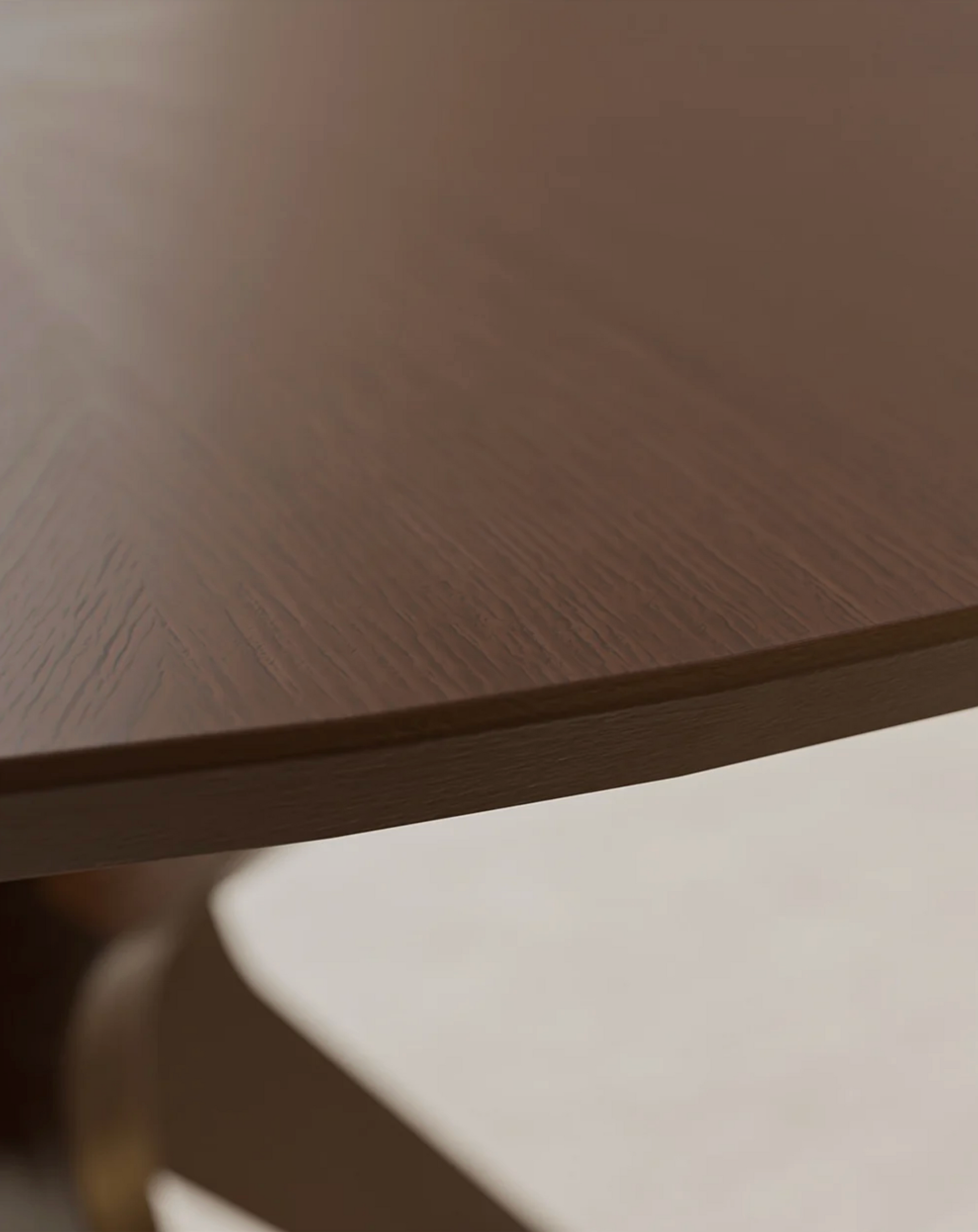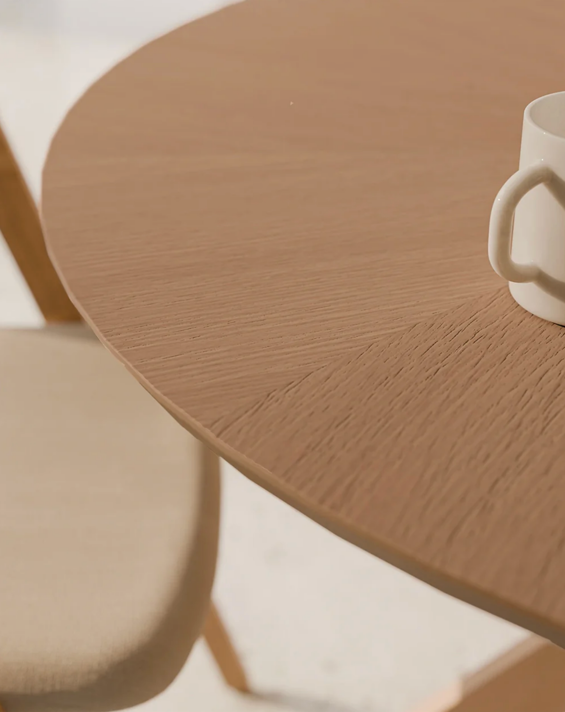 Esta mesa redonda de comedor está fabricada con una sólida estructura de madera, destacando una tapa de acabado en roble de 25 mm de espesor, lo que garantiza durabilidad y una estética cálida que aporta un toque natural y acogedor a los espacios.